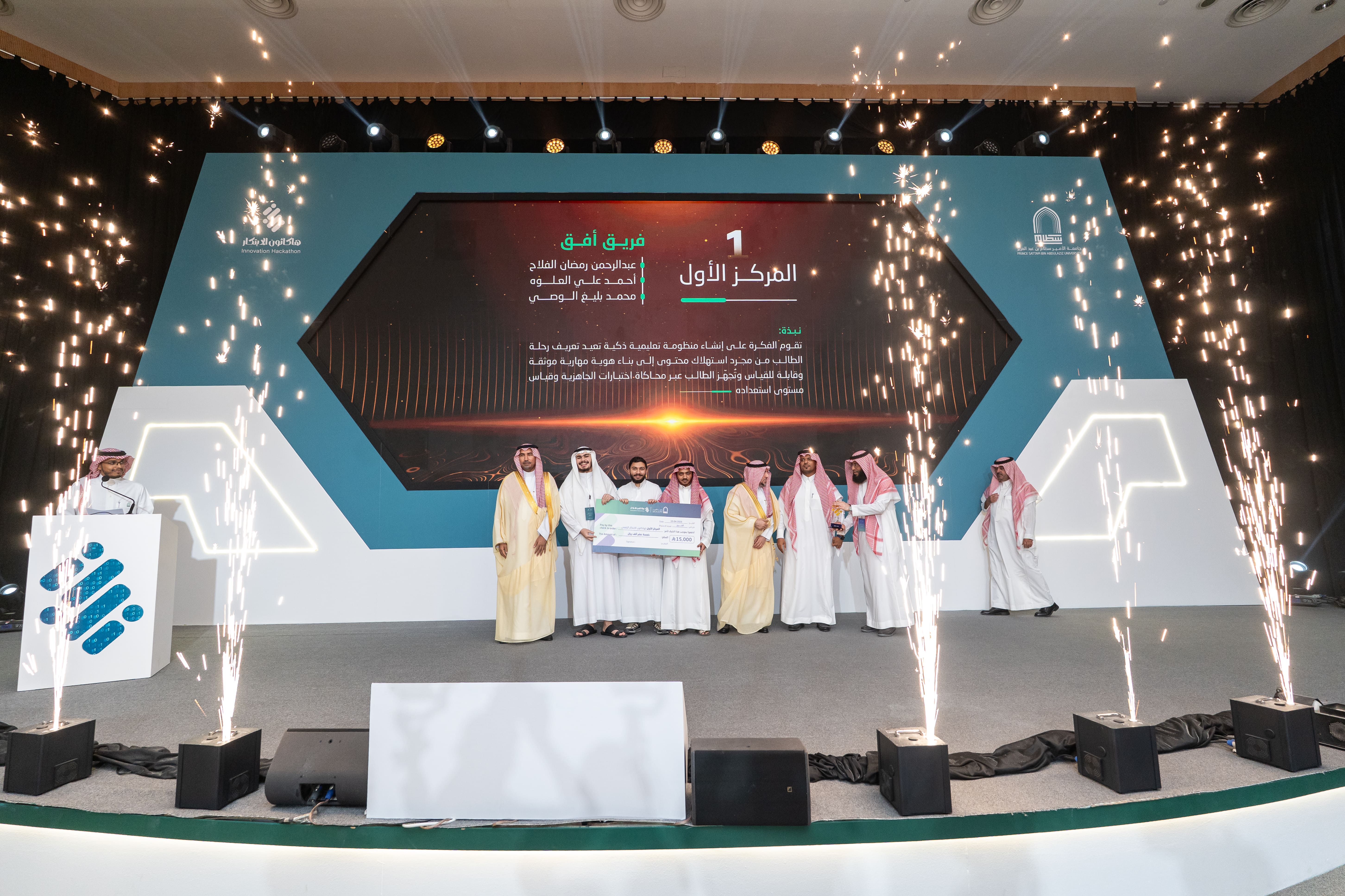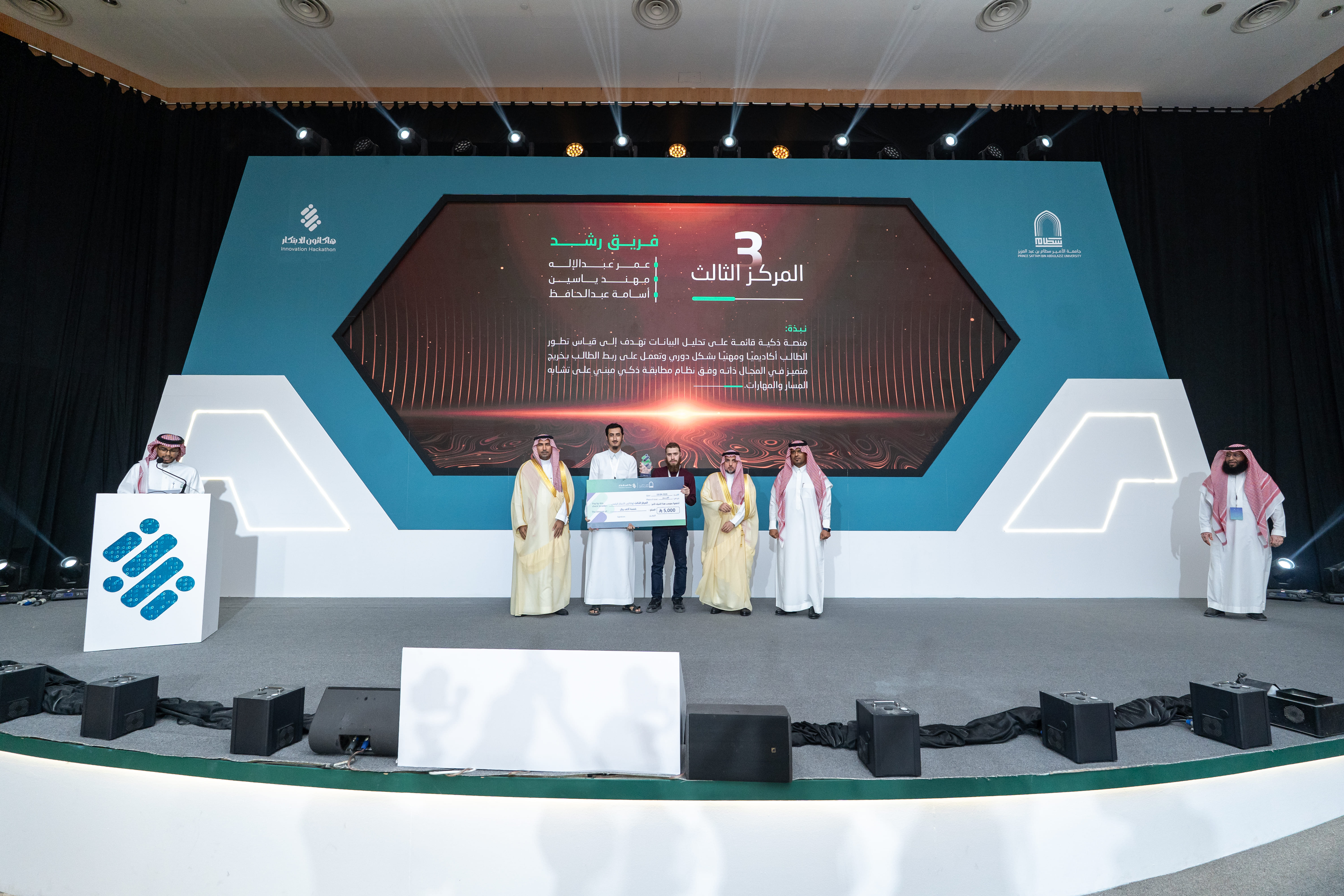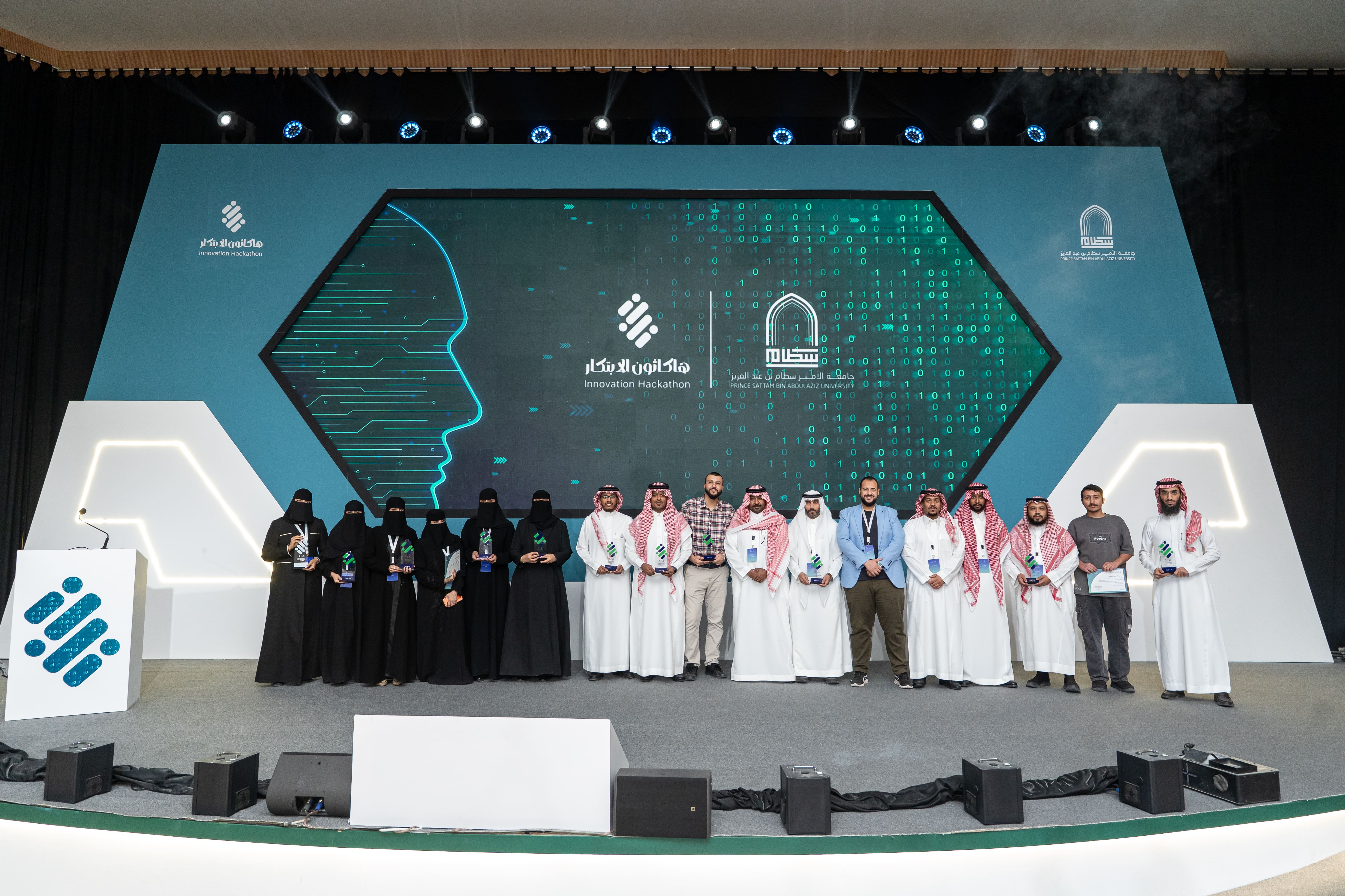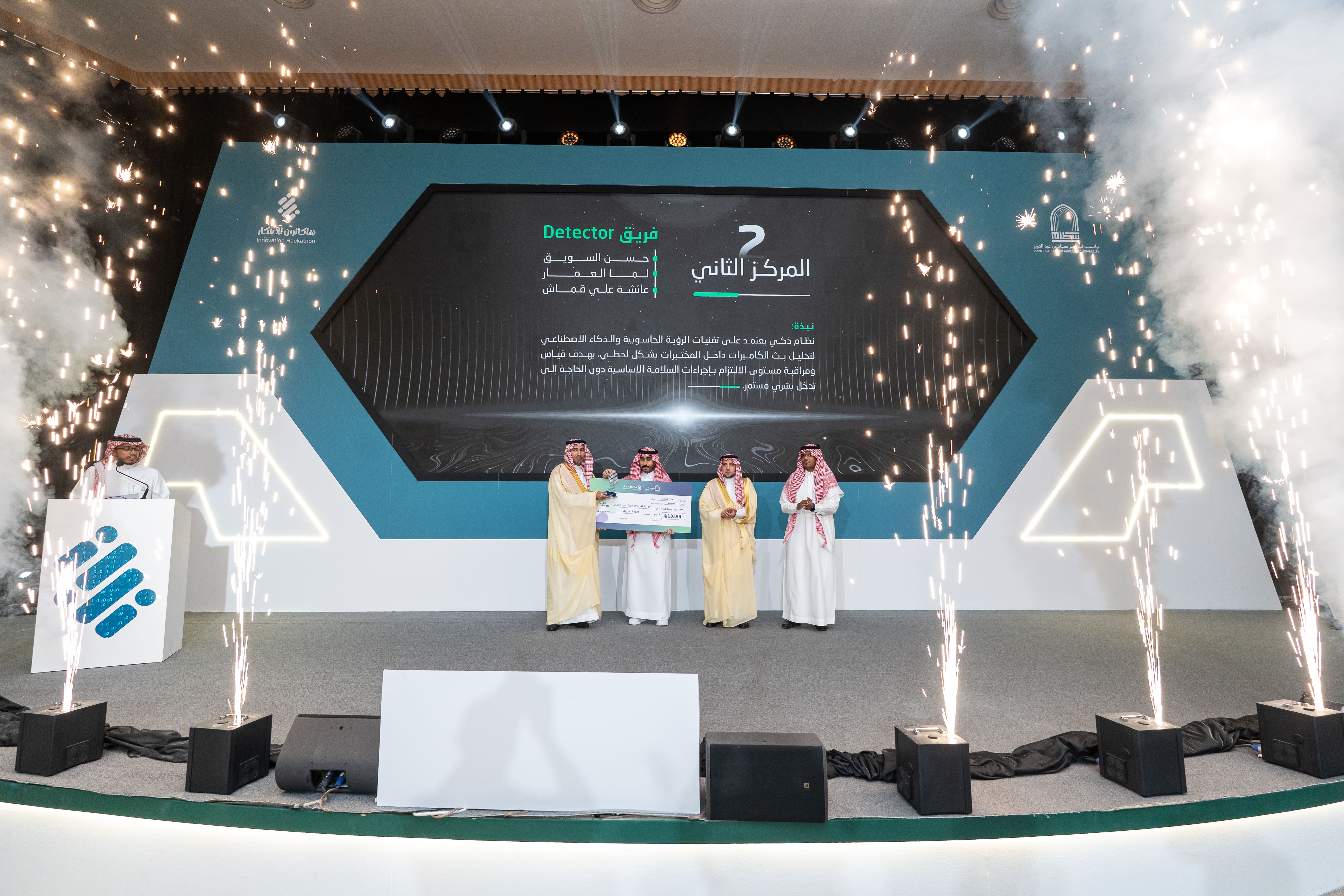 At the conclusion of the ceremony, His Excellency the University President honored the judging committee, sponsoring entities, and organizers, and awarded the top three winning teams. Team Ufuq won first place for its Smart Educational System project and received a prize of SAR 15,000. Team Detector secured second place for its Computer Vision and Artificial Intelligence System project and was awarded SAR 10,000, while Team Rushd came in third for its Smart Data Analytics Platform project, receiving SAR 5,000.